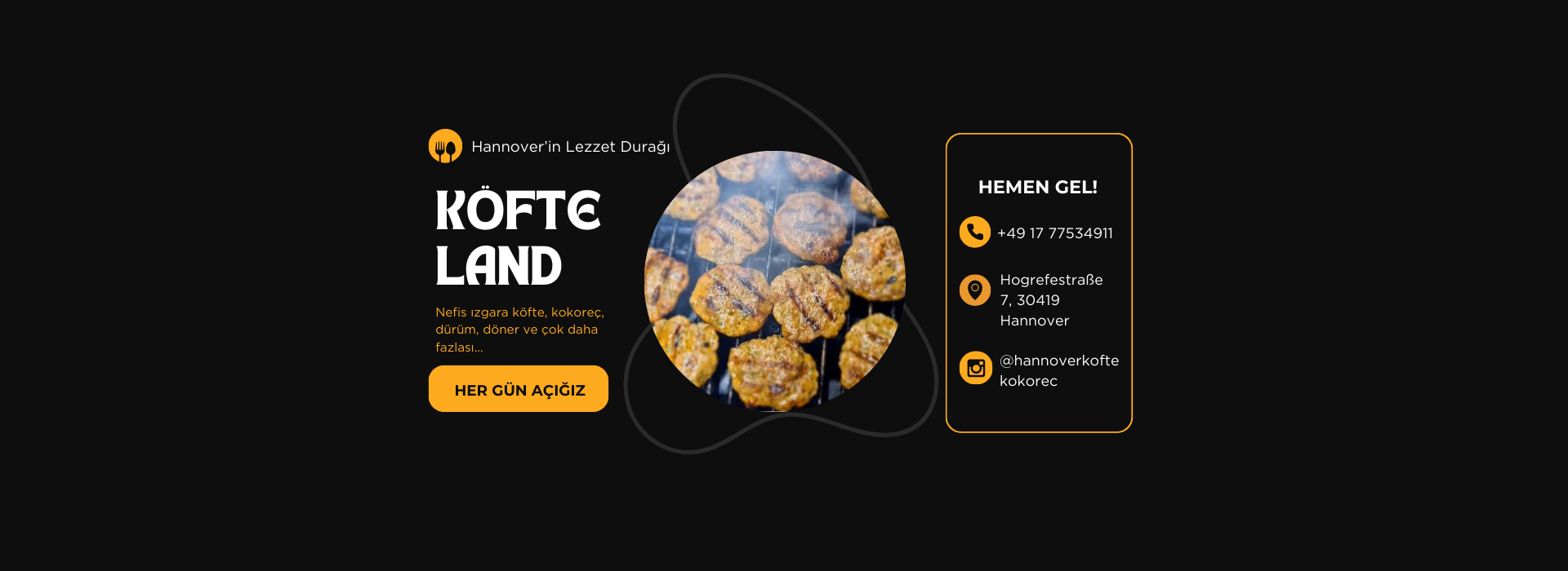 Köfte Land, haftanın her günü 10:00 – 23:00 arası açık. Köfte Land’e gelerek Hannover’de unutulmaz bir Türk mutfağı deneyimi yaşayın.